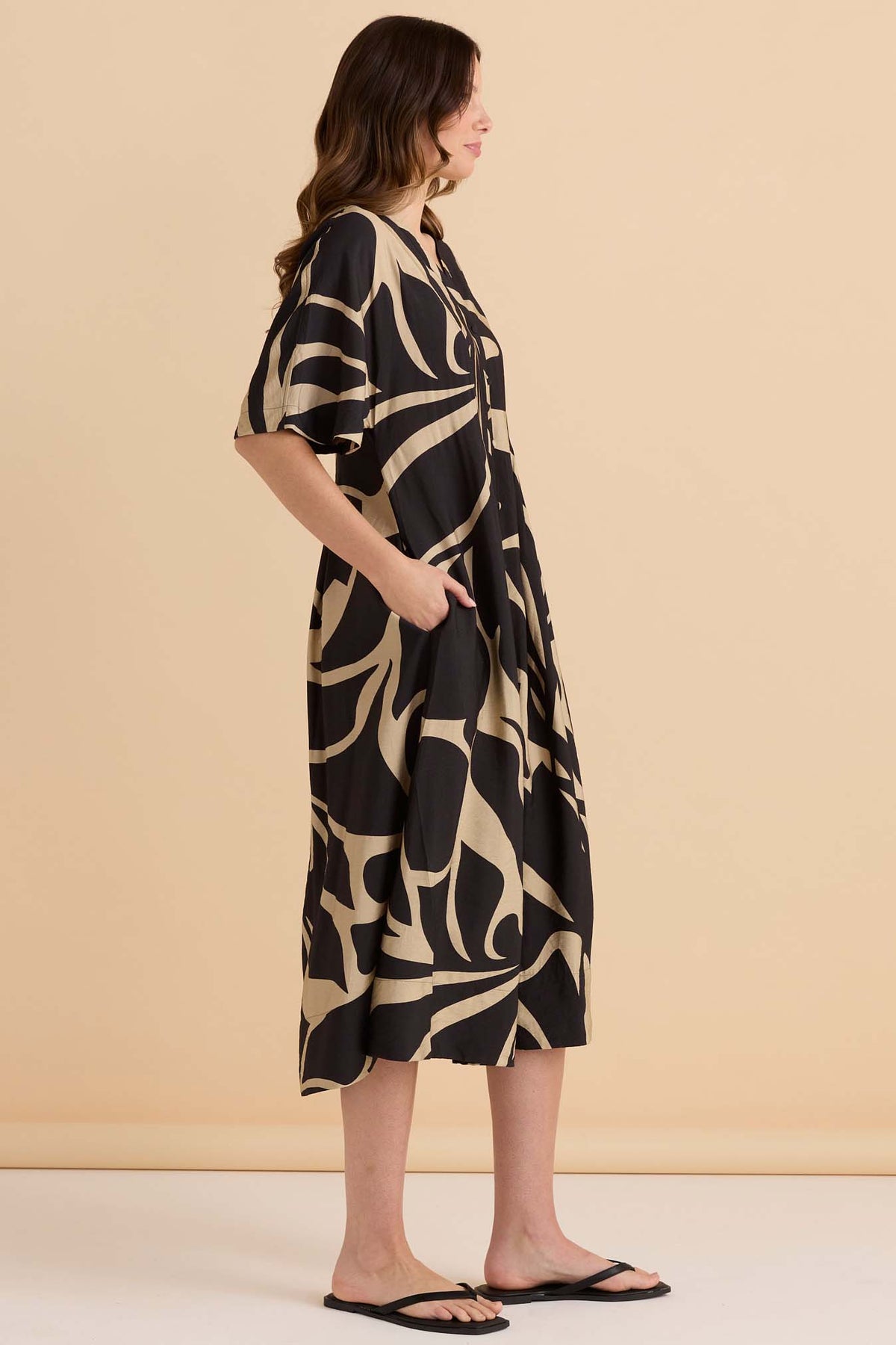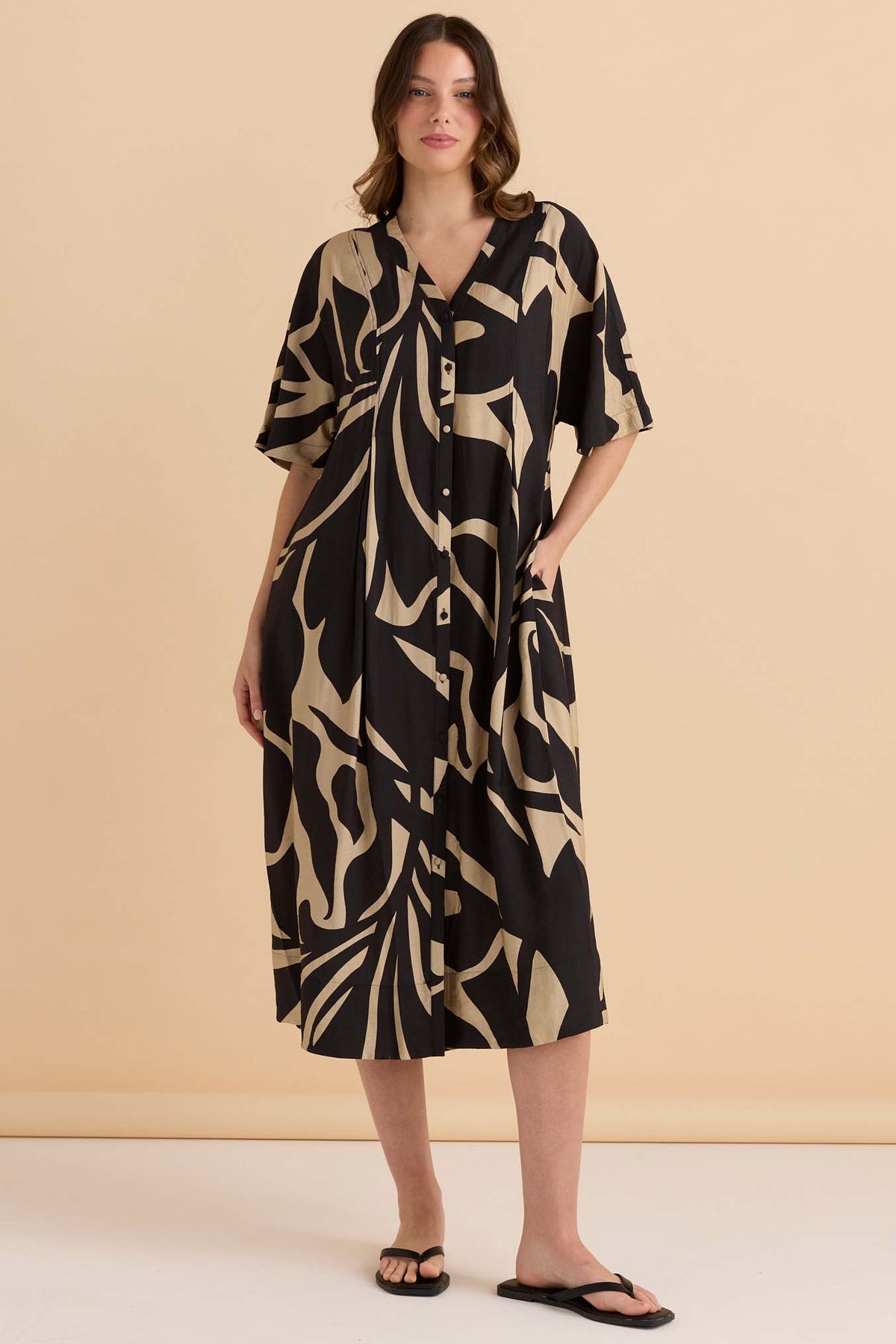The true shirt dress styling adds subtle structure, while the monochrome floral print keeps the look bold yet timeless. It’s statement enough to stand alone, yet neutral enough to wear season after season.