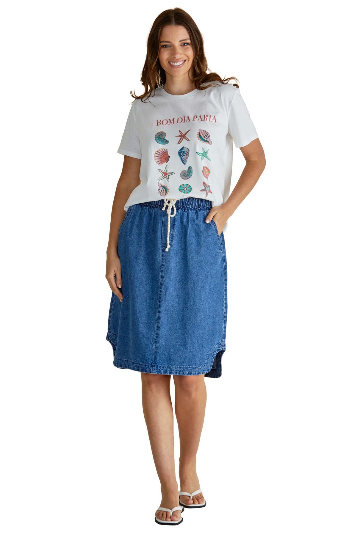 The Dara denim skirt in Vintage Blue is this season's wardrobe staple. It's high waist is elasticated and comes with tie. There are front and back pockets, a mock front fly and a tongued hem front and back for ease of movement.